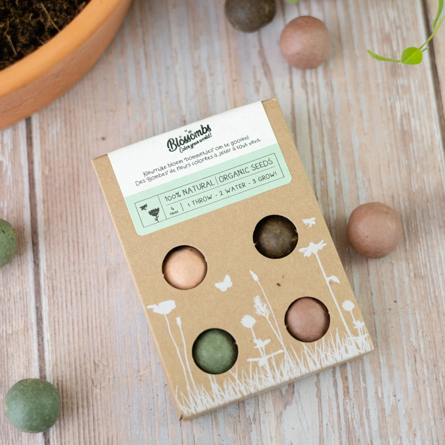 Bloem ‘bommetjes’, verpakt als leuke cadeautjes. In de Blossombs zit een biologische wilde bloemenzaadmix. Deze bestaat o.a. uit de volgende bloemzaden: Phacelia, vlas, gele mosterd, koriander, vlasdotter, kaasjeskruid, klaproos, bolderik, korenbloem, kamille, Perzische klaver, inkarnaatklaver, Alexandrijnse klaver. Sommige zaadjes komen meteen aan het begin van het seizoen op (mrt/apr), andere pas aan het eind (sep/okt), daardoor heb je eigenlijk met 1 Blossomb het hele seizoen bloemen! Deze bloemmengsels geven kleur aan uw tuin en zijn voedsel voor vlinders, bijen en hommels. Ze worden op een duurzame manier in eigen land geproduceerd en zijn gemaakt van 100% natuurlijke ingrediënten en biologische, wilde bloemzaden. Ook de verpakkingen zijn van duurzame en/of gerecyclede materialen.