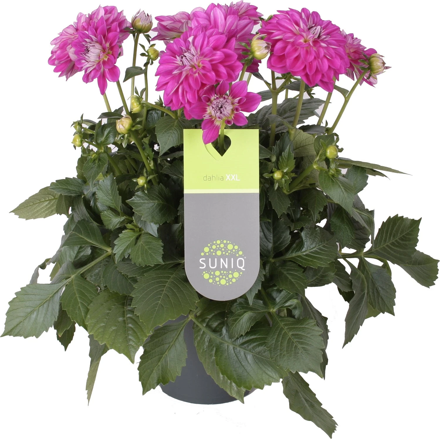 Deze sterke bloeier heeft ronde bolvormige paarsroze bloemen. Deze soort heeft een sterke groei en heeft daardoor een hoge sierwaarde. Komt tot zijn recht zowel in de borders in de volle grond als in potten. De Dahlia is er een vele soorten. Er zijn soorten die laag blijven, maar ook soorten die in 1 seizoen wel 6 meter kunnen worden. Het is een knolvormend gewas. De soorten die wij meestal in de tuin zetten zijn zeer decoratieve met hun grote bloemen die mooi opvallen met hun felle kleur tussen de donkergroene bladeren.