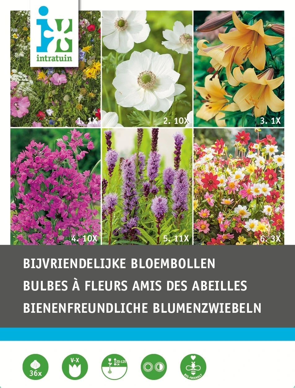 Prachtig assortiment bloembollen welke speciaal is samengesteld uit soorten met bloemen die veel nectar en stuifmeel hebben, om bijen, hommels en vlinders naar je tuin te lokken. De bloeiperiode van deze bloembollen is van mei tot oktober. De planttijd is van maart-mei, op een beschutte plaats in de zon of lichte schaduw. De bloemkleuren variëren van wit, geel, roze tot paars en rood, zodat de sfeer van een bloemenweide of Cottage-garden wordt benaderd. Geef de bollen na het plant voldoende water, zodat ze gaan uitlopen. Deze planten kunnen jarenlang op dezelfde plaats blijven staan en zijn winterhard. De hoogte wordt na enkele jaren maximaal 150 cm.