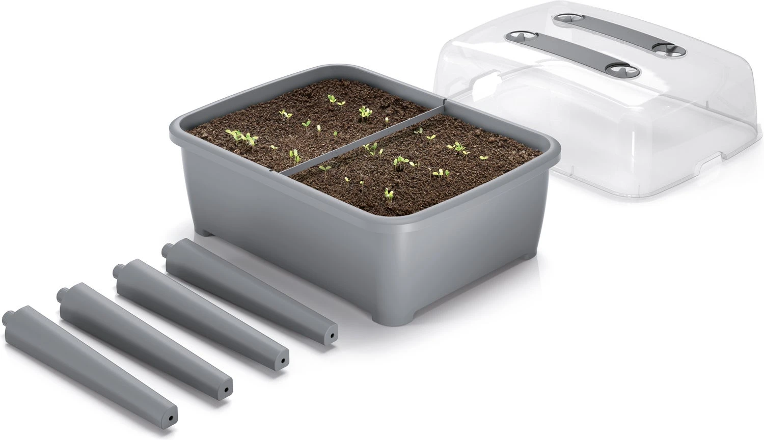 Deze kweekbak van Intratuin is een 4 in 1 set. Ideaal om binnen of buiten eenvoudig je groenten of kruiden te kweken! De kweekbak heeft een inhoud van 83 liter en heeft inclusief een deksel met ventilatiegaten, met verstelbare sloten (insecten bescherming) een bloembak, verwijderbare korte onderzetpoten en verwijderbare hoge onderzetpoten.