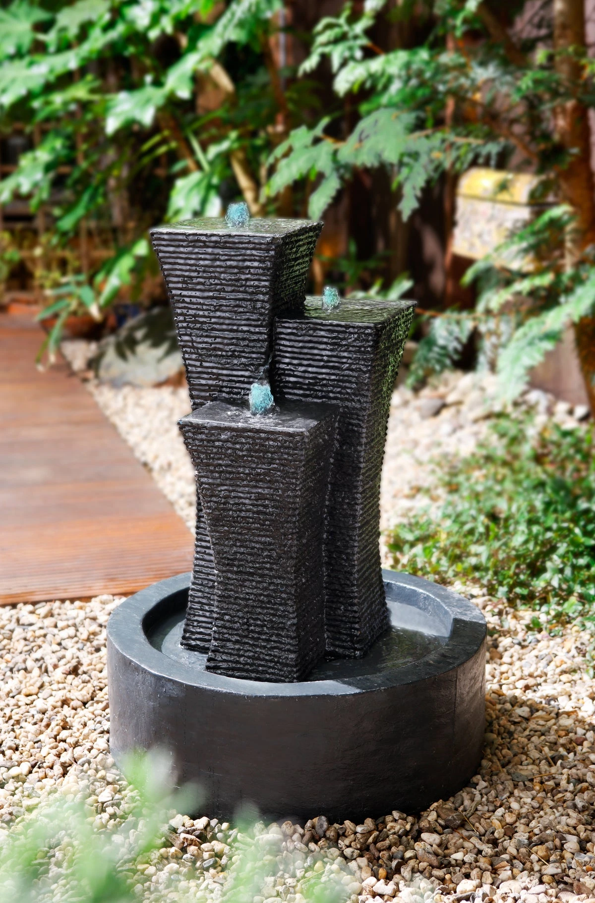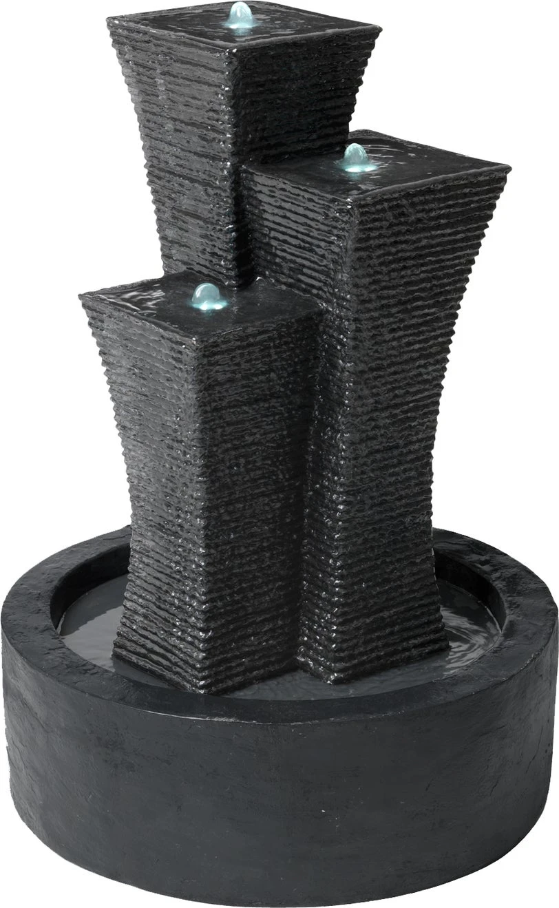 Deze drie speels vormgegeven pilaren met ribmotief laten het water langzaam naar beneden sijpelen. Het ornament is gemaakt van Polyresin en voorzien van 3 led lampjes in de kleur warm wit, 10 meter kabel en een lage voltage waterpomp met adapter. 2 jaar garantie.