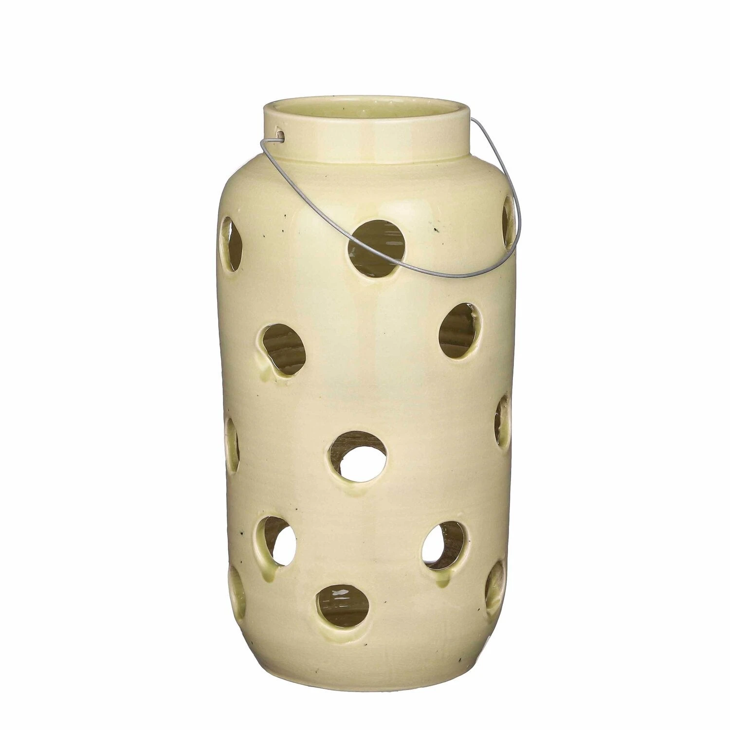 Met wat sfeerverlichting maak je het tijdens een avond in de tuin extra gezellig. Doe bijvoorbeeld een kaarsje in de Arena lantaarn van Mica Decorations. De lantaarn is gemaakt van hoogwaardige terracotta klei uit Portugal en valt op door het mooie design in een zachte, gele kleur. Past op elk terras of balkon! De ronde gaten geven het geheel een speelse uitstraling en zorgen voor een mooie verspreiding van het licht. Daarnaast kun je hem door het hengsel gemakkelijk verplaatsen. De Arena lantaarns zijn verkrijgbaar in verschillende kleuren en maten. Leuk om met elkaar te combineren! Dit gele model is 50 cm hoog en heeft een diameter van 25 cm.