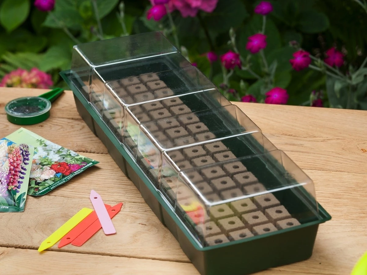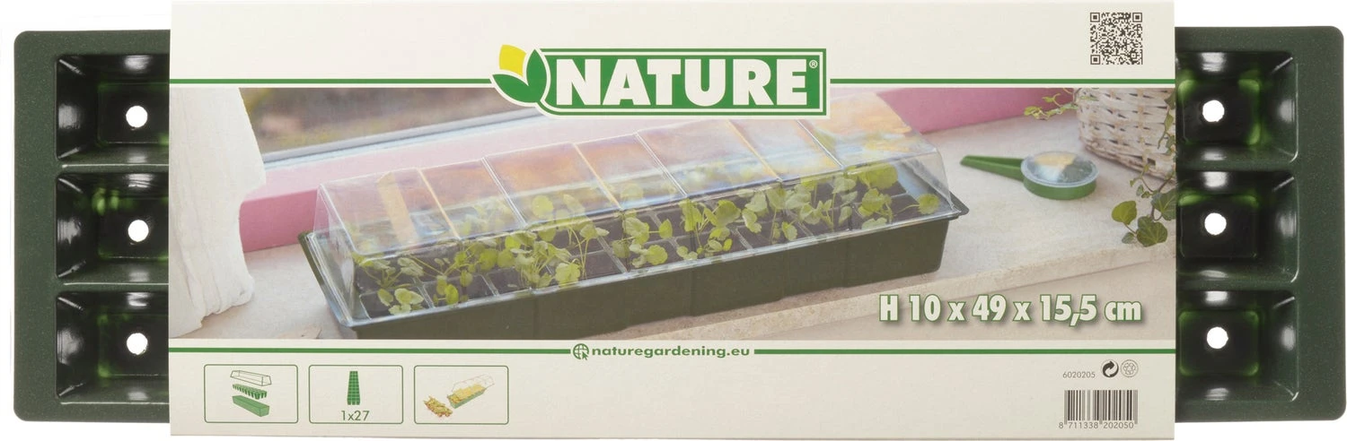 Nature vensterbankbroeikasje met bijbehorende tray van 27 vakjes en transparante deksel. Perfect voor in de vensterbank. Gemaakt van flexibel kunststof. Afmeting 49×15,5x10cm.