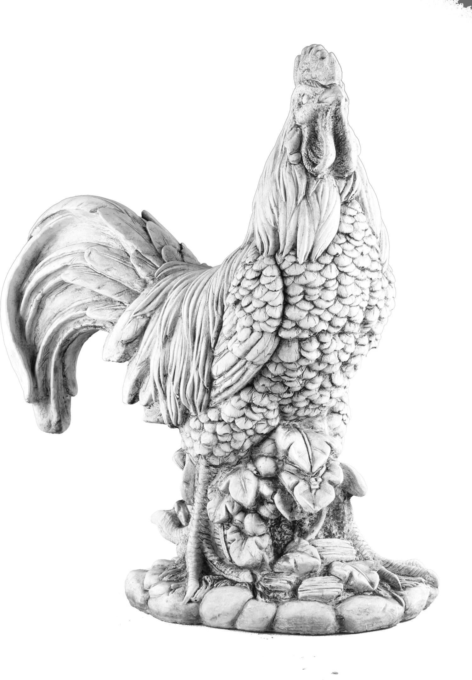 Dit robuuste tuinbeeld heeft de vorm van een staande haan met wat bladeren aan de onderkant. De tuindecoratie en is een originele aanvulling voor je tuin. Plaats het op je terras, bij de vijver of in je moestuin om wat extra sfeer te creëren. Het beeld is van beton en bestand tegen alle weersomstandigheden. De tuindecoratie weegt 10 kg waardoor het beeld ook bij wat wind niet zomaar wegwaaid. De afmetingen zijn 31 x 14 x 38 cm.
