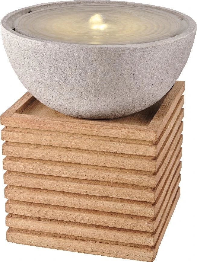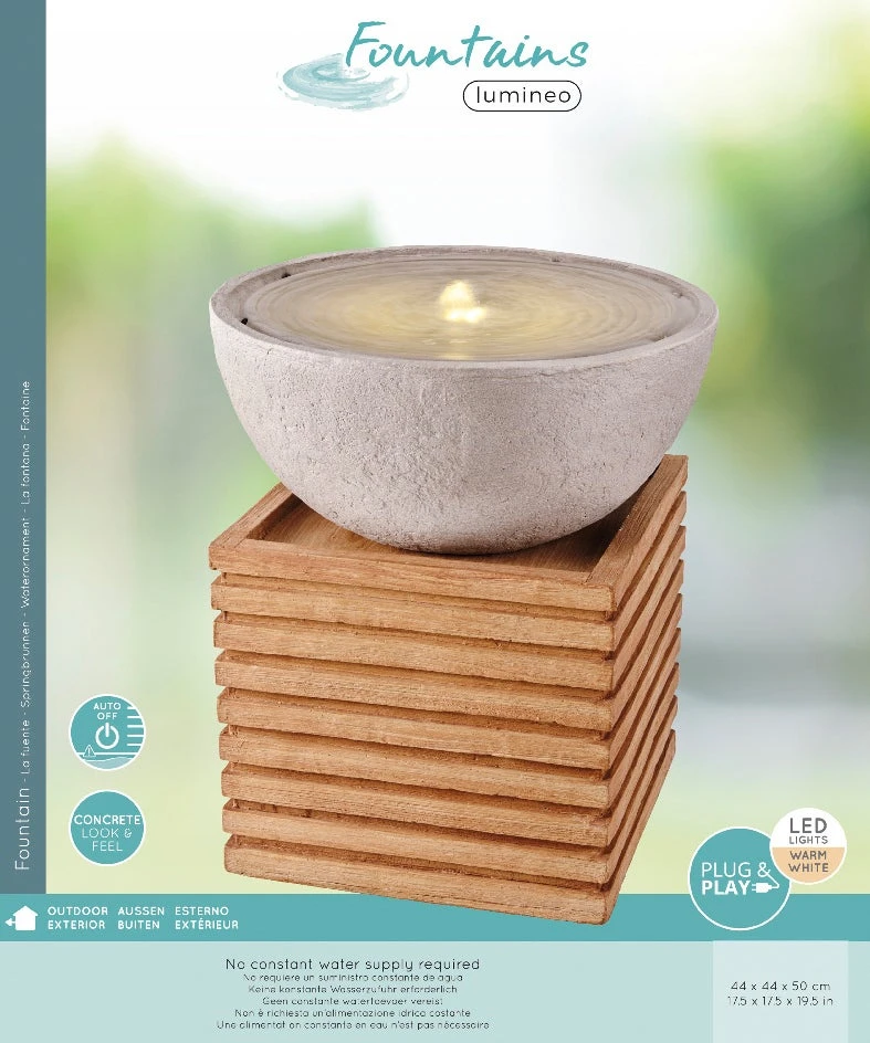 Geen ruimte voor een vijver, maar toch het ontspannende geluid van sijpelend water in de tuin? Dat kan met dit prachtige waterornament. Waterornamenten geven meteen sfeer in je tuin, ontspannen hoeft niet meer moeilijk te zijn! Deze fontein Sati in de kleur grijs met warm hout maakt jouw tuin of interieur helemaal af. De ingebouwde LED verlichting heeft de kleur warm wit en zorgt er voor dat je waterornament er ’s avonds in het donker ook mooi bij staat. De pompcapaciteit is 350 l/h. De afmetingen zijn 44 x 44 x 50 cm. Geniet van al het moois om je heen!